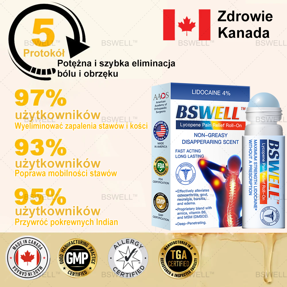 W takim razie nasz Lidokainowy Łagodzący Ból w Rolce Żel do ulgi w bólu jest idealny dla Ciebie! Ściśle współpracowaliśmy z czołowymi ekspertami w zakresie zarządzania bólem i naprawy skóry, aby opracować rewolucyjny produkt, który wykorzystuje silne właściwości łagodzące ból i leczące lidokainy. BSWELL™ Lidokainowy Łagodzący Ból w Rolce Żel o maksymalnej sile działania to idealny booster, który pomoże Ci zwalczyć różne bóle i niedogodności, pozwalając Ci żyć bez bólu i cieszyć się komfortem oraz witalnością każdego dnia.