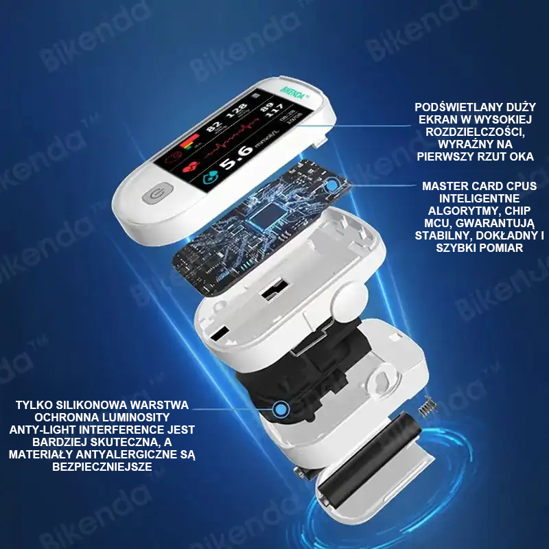 Pierścień silikonowy chroniący przed światłem i szybki pomiar: Urządzenie Bikenda™ jest wyposażone w pierścień silikonowy chroniący przed światłem, który lepiej dopasowuje się do palców i redukuje zakłócenia spowodowane światłem otoczenia. Konstrukcja ta pozwala na dokładniejsze pomiary, a wyniki są dostępne już po 5 sekundach.
